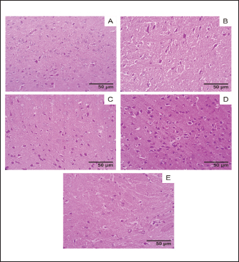 Fig. 4. Brain histology acute oral toxicity test of mice on day 15 of single dose administration. (A) Control Group; (B) Dose 5 mg/kg; (C) Dose 50 mg/kg; (D) Dose 300 mg/kg; (E) 2,000 mg/kg. (400×, H&E stained).
