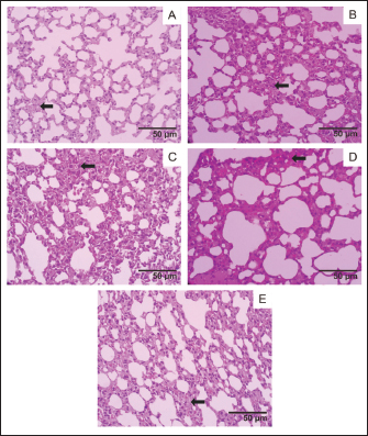 Fig. 5. Lung histology, acute oral toxicity test of mice on day 15 of single dose administration. (A) Control Group; (B) Dose 5 mg/kg; (C) Dose 50 mg/kg; (D) Dose 300 mg/kg; (E) 2,000 mg/kg. (400×, H&E stained).