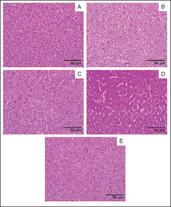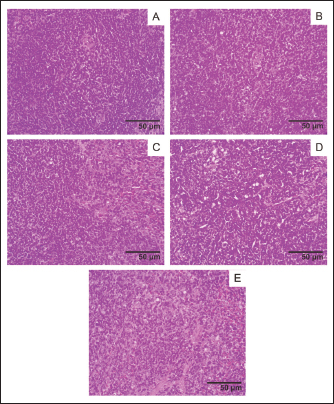 Fig. 7. Liver histology, acute oral toxicity test of mice on day 15 of single dose administration. (A) Control Group; (B) Dose 5 mg/kg; (C) Dose 50 mg/kg; (D) Dose 300 mg/kg; (E) 2,000 mg/kg. (400×, H&E stained).