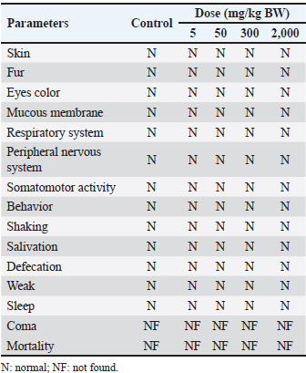 After the experiment was completed, the samples were collected. Collected organ samples were weighed in order to observe the gross anatomy and histopathological examinations. Furthermore, the blood samples were run for hematology and bioassay analysis (OECD, 2002; BPOM, 2022). Toxicology analysis in miceToxicity in the acute oral test annotated with 50% Lethal Dose (LD50) in mice was determined by evaluating the global harmonized system (GHS) levels according to the categories specified in OECD 423, which include category 1 (less than 5 mg/kg), category 2 (between 5 mg/kg and 50 mg/kg), category 3 (between 50 mg/kg and 300 mg/kg), category 4 (between 300 mg/kg and 2,000 mg/kg), and category 5 (between 2,000 mg/kg and 5,000 mg/kg). Gross anatomy analysisThe 15th day brought the sacrifice of every mouse. The method of euthanasia involved intraperitoneal injections of xylazine (Interchemie, Metaalweg, Netherlands) at 2% dosages and ketamine (Kepro, Maagdenburgstraat, Netherlands) at 10% doses of 100 mg/kg BB. This approach facilitated swift and painless euthanasia, adhering to OECD 423. The organ samples, i.e., brain, lung, kidney, liver, spleen, and testes, were collected. The samples were rinsed with NaCl 0.9%. (Merck, Darmstadt, Germany). Filter paper was used to dry the organ samples. The gross pathological features, such as color, irregularities, and consistency, were evaluated. The organ sample mass was weighed, and in relation to body weight, the relative organ weights were computed and documented using the following formula: