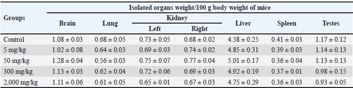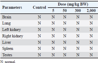 Macroscopic examinationsVital organs, including the brain, lungs, kidneys, liver, spleen, and testes of both the control group of mice and the animals receiving the herbal mixture at the highest dosage (2,000 mg/kg BW), are examined microscopically. The macroscopic alterations in the treatment groups and the control group did not significantly vary from one another (Fig. 3; Table 3). There is no discernible difference in any of the groups’ organ-to-body weight indices (p > 0.05).