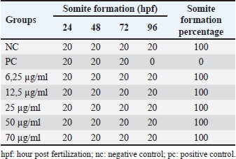 Table 9. Somite formation in zebrafish (Danio rerio) embryo after 96 hours of exposure.
