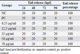 Table 10. Release of the tail-bud portion of the yolk in zebrafish (Danio rerio) embryo after 96 hours of exposure.