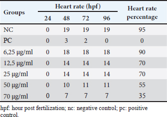 Table 11.Heart rate in zebrafish (Danio rerio) embriyo after 96 hours exposure.