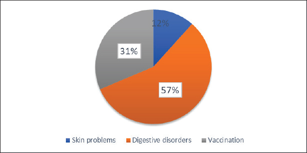 Fig. 4. Reasons for the consultation. Prevalence of canine DMThe prevalence was determined by applying the following formula : Observed diabetes prevalence (ODP)=(number of diabetic animals (DA)/number of animals screened (AS)) × 100%