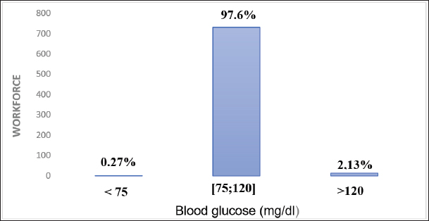Risk factors for diabetesDiabetic status of canines based on blood glucose levelsWe cross-referenced diabetic status with blood glucose values to determine whether there was a link between these two variables. The results are presented in Table 4. The observation in Table 4 shows that hyperglycemia was present in all dogs diagnosed as diabetic. Statistical analysis using the Chi-square test (u03c7²) revealed a significant difference between groups (χ²=138.365ᵃ; ddl=2; p=0.00 < 0.05), indicating a statistically significant association between glycemic status and the occurrence of DM in dogs. Hyperglycemia would reflect an alteration in carbohydrate metabolism, probably due to insulin deficiency or insulin resistance. Table 4. Diabetic status of dogs according to blood glucose levels.