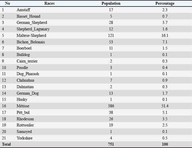where f is the observed proportion and n is the sample size. Data processing and analysisAll data were digitally recorded using KoboCollect and later transferred to Microsoft Excel and SPSS for statistical analysis. Descriptive statistics (frequencies, means, and standard deviations) were computed. Comparisons between variables (e.g., age, sex, and breed vs. diabetic status) were conducted using the chi-square test or Student’s t-test, with significance set at p < 0.05. Confidentiality was ensured by anonymizing the personal identifiers (names, addresses, and contact information of the clinic owners). Ethical approvalThe study was conducted with the approval of the « Comité du département de Médecine Vétérinaire de l’Institut Supérieur des Sciences et de Médecine Vétérinaire de DALABA » under the following number DMV0352021. The animal experimentation was conducted under the supervision of the Cabinet Veterinaire WOULADA under Number 18418F. ResultsResults of surveys among veterinarians and archives analysisConsultation was held with veterinarians from the Department of Veterinary Services and private veterinarians practicing in the urban commune of Cocody. These included professionals from the Latrille Veterinary Clinic, Akwaba Veterinary Practice, Angré Veterinary Clinic, Riviera Veterinary Clinic, and Technical High School Veterinary Clinic. During the interviews, due to a lack of previous studies on canine diabetes, no comprehensive data were available on the affected canine population (Table 1) or on the main causes of the disease. However, the analysis of the archives revealed the previous presence of the disease, with approximately 10 cases reported, mainly in older dogs. Diagnoses were most often based on clinical suspicion alone. The lack of specific veterinary treatments, combined with the high cost of care, often led owners to abandon their affected animals. Some corticosteroids, such as cortisol and prednisolone, have been reported to be administered at specific doses in treatment protocols. Furthermore, the interviewed veterinarians did not know the types of food provided by the owners to the animals. Table 1. Diabetes mellitus status in dogs according to private clinics.