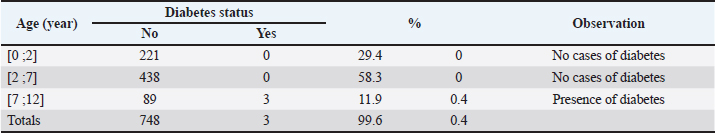 Age-related DM statusOur results indicate that dogs aged between 7 and 12 years are most likely to develop diabetes. The chi² test applied to the relationship between diabetes and age in the urban municipality revealed a highly significant association (p=0.00), confirming the existence of a link between these two variables. This relationship could be explained by the progressive aging and slow regeneration of pancreatic cells in dogs aged >5 years (Table 10). Table 9. Diabetic status of the dogs according to sex.