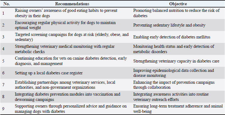 Diabetic status is linked to a sedentary lifestyle in dogsTable 11 shows that diabetes was only observed in sedentary dogs. However, the Chi-square test (u03c7²) revealed no significant difference between prevalences at the 5% threshold (χ²=0.70; ddl=1; p=0.792 > 0.05), indicating that sedentary lifestyle and the onset of diabetes did not have a statistically significant association. Proposed control measuresIn light of the obtained results, some measures have been proposed to prevent or control the onset of diabetes in dogs (Table 12). DiscussionThis study, conducted in the urban district of Cocody, brings to light a clinically established yet under-documented reality: the confirmed occurrence of DM in dogs over a period exceeding ten years. The 10 confirmed cases between 2009 and 2021 show that this condition is not new, although it is rarely detected. The diagnosis was based mainly on the history of the classic clinical signs (polyuria, polydipsia, and polyphagia) and biochemical analyses. These practices are consistent with the current diagnostic protocols reported in the veterinary literature. However, cases of treatment abandonment by owners have been observed, a phenomenon also highlighted by Jeantin (2016) in France, where 18% of diabetic dogs died following treatment discontinuation. This trend appears to be linked to the treatment’s logistical and financial requirements. In particular, the need for daily insulin administration is likely to discourage dog owners, especially in an African context characterized by limited resources. The results of this study must be understood within the specific sociocultural and economic context of Cocody and, more broadly, urban West Africa. In terms of dog distribution, the density data obtained in Cocody revealed a low concentration of dogs, with an average of 6 dogs/km². This observation is significantly lower than that reported in France by Bretagne (2018), who established a density of 58 dogs/km². This difference could be attributed to sociocultural factors, globalization, and dogs’ role. While dogs are often perceived as companion animals in Western countries, they are primarily valued for their practical purposes, such as providing security or hunting, in many African contexts. According to the survey, 84% of the respondents were unaware that dogs could develop diabetes, considering it an exclusively human disease. In contrast, only 16% were aware that dogs could be affected by diabetes. This lack of awareness is in line with the observations made by Millogo et al. (2015) in Ouagadougou, where 96.3% of people knew about diabetes only in its human form. The absence of veterinary information campaigns targeting the public could explain this major gap in understanding canine pathologies. The diversity of dog breeds found in the municipality is relatively low compared with that observed in France, where the French Kennel Club counted 289 breeds in 2020 (Société Centrale Canine, 2020). This contrast probably reflects the limited number of imports, the predominance of mixed-breed dogs, and the lower value placed on racial selection in local practices. Table 12. Recommendations for the prevention and management of canine diabetes.