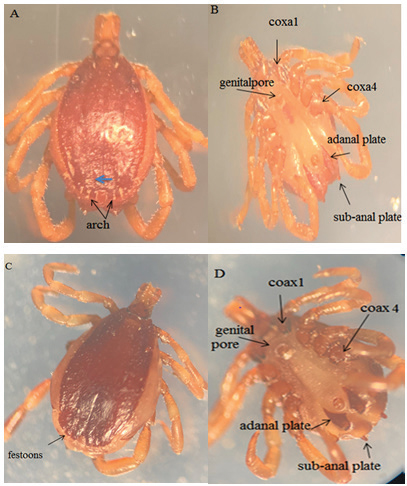 Fig. 1.Morphological detection of H. excavatum (A, B) and H. anatolicum (C, D) adult males by microscopy. (A) Dorsal view of H. excavatum showing the anterior fusion paraparmeral festoons (arch) and the bulge arrows marking the caudal ridges. (B) Ventral view showing the genital pore, ventral plates, and coxae I and IV. (C) Dorsal view showing the fetoons (absence of the anterior arch) of H. anatolicum. (D) Ventral view showing the genital pore, ventral plates (adnal and subanal plate), and coxae I and IV. Molecular identification of ticks (16S rRNA PCR)Tick species were confirmed using PCR amplification of the mitochondrial 16S rRNA gene using Ixodidae-specific primers (Han et al., 2019). The primer sequences were as follows: forward 5′-CTGCTCAATGATTTTTTAAATTGCTGTGG-3′ and reverse 5′-CCGGTCTGAACTCAGATCAAGT-3′. PCR reactions were prepared in 20 µl volumes containing 10 µl PCR Master Mix, 2 µl (0.5 pmol) of each primer, 2 µl of DNA template, and 4 µl of nuclease-free water. Cycling conditions included initial denaturation at 95°C for 3 minutes, followed by 39 cycles of denaturation at 95°C for 35 seconds, annealing at 53.8°C for 35 seconds, and extension at 72°C for 35 seconds, with a final extension at 72°C for 5 minutes. PCR products (~450 bp) were separated by electrophoresis on 1.5% agarose gels stained with ethidium bromide and visualized under UV illumination. DNA sequencing and phylogenetic analysisPositive amplicons were purified and submitted for Sanger DNA sequencing to Macrogen Inc. (South Korea). Raw sequences were trimmed and edited using Chromas software and compared with reference sequences in the National Center for Biotechnology Information GenBank database using BLAST. Phylogenetic analysis was conducted using MEGA 11 software to compare the relationships between tick sequences from Iraq and global reference strains. qPCRReal-time polymerase chain reaction was employed to determine the prevalence and density of FLE, Ca. M. mitochondrii, and T. annulata. Macrogen Inc. designed synthetic plasmids containing specific target genes (Table 1) to generate duplicate standard curves. Plasmids were serially diluted from 107 to 10¹ copies to prepare reference standards. qPCR reactions were performed in 20 µl volumes containing: 10 µl SYBR Green Master Mix (AddBio, Korea), 1 µl of each primer, 3 µl of template DNA, and 5 µl of nuclease-free water. The amplification conditions included an initial denaturation at 95°C for 10 minutes, followed by 40 cycles at 95°C for 20 seconds, annealing at optimized temperatures between 50°C and 60°C for 30 seconds, and extension at 72°C for 30 seconds. A melt curve analysis was conducted from 60°C to 95°C to confirm the specificity of the product. Copy numbers were normalized against the tick single-copy ribosomal protein L6 (rpl6) gene of Ixodes scapularis, previously validated for tick normalization (Al-Khafaji, 2018). Table 1. Gene targets for amplification and sequencing.