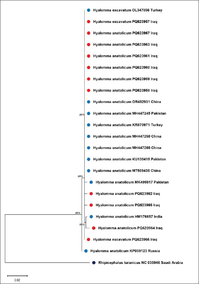 Fig. 3. Phylogenetic tree of H. anatolicum based on partial mitochondrial 16S rRNA sequences. The tree was constructed using the maximum likelihood method (Tamura–Nei model, 100 bootstrap replicates) in MEGA 11. Local sequences (PQ623957–PQ623967) were closely clustered with references from China, Turkey, Pakistan, India, and Russia, showing 99.48%–100% identity. The branch lengths represent the genetic distances. Table 2. Homology sequence identity (%) between local hard ticks and global NCBI-BLAST H. anaolicum and H. excavetum.
