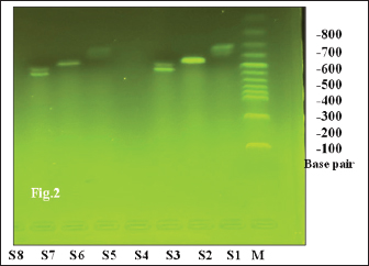 Fig .2. DNA products of Candida spp. generated using the universal primers ITS4 (510 bp) line S2 and S7 and ITS5 (721 bp) gene primers line S1 and S6 stained with ethidium bromide. M: Molecular marker (100 bp); lanes 1–8, Candida spp. Oral diseases and isolation of Candida from the oral cavities of cat ownersAs presented in Table 4, a statistically significant difference was observed in the prevalence of Candida isolation between individuals with and without oral lesions (p < 0.001). Furthermore, a significant inverse correlation was identified between the presence of oral lesions and the isolation of Candida species from the oral cavity of domestic cat owners (p < 0.001). Table 2. Demographics as a possible risk factor of Candida infection among cat owners.
