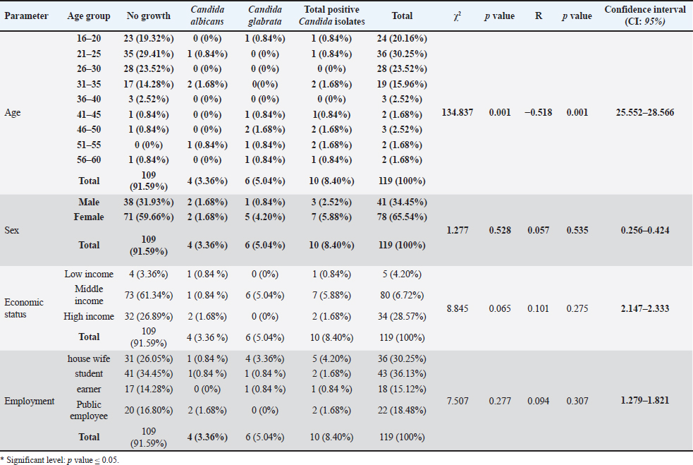 Possible risk factors associated with C. albicans among cats and their ownersAs shown in Table 2, a significant difference was reported between the age groups infected with Candida spp. (p value < 0.001). A significant inverse correlation was reported between age group and isolation of Candida spp. (p value < 0.001). No significant difference was reported between sex and Candida isolation (p=0.528). No significant correlation was reported between sex and Candida isolation. From the oral cavity of cat owners (p=0.535). No significant difference (p=0.065) or correlation (p=0.275) was reported between economic status and Candida spp. isolation from the oral cavity of the cat owners. No significant difference (p=0.277) or correlation (p=0.307) was reported between employment and Candida spp. isolation from the oral cavity of the cat owners. Significant differences and inverse correlations were reported between vitamin D3 deficiency and Candida spp. isolation (p value=0.006). Significant differences (p=0.005) were reported between seasons in the isolation of Candida from the oral cavity of cat owners. No significant correlation (p=0.507) was reported between season and the isolation of Candida spp. from the oral cavity of the cat owners. No significant difference was reported among smokers and nonsmokers in the isolation of Candida spp. from the oral cavity (p=0.562). No significant correlation (p=0.496) was reported between smoking habit and Candida spp. isolation from the oral cavity of the cat owners. As shown in Table 3, there was a significant difference (p=0.001) in the isolation of Candida from the oral cavity of cat owners who were administering antibiotics and those who were not. A significant negative correlation (p value < 0.001) was reported between the use of oral antibiotic drops and the isolation of Candida spp. from the oral cavity of the cat owners. No significant difference was observed between those wearing dentures and those not wearing dentures in the isolation of Candida spp. (p=0.714). No correlations (p=0.992) were reported between wearing dentures and the isolation of Candida spp. from the oral cavity. A significant difference (p=0.001) was reported between those with and without Diabetes miletus (DM) in the isolation of Candida spp. from the oral cavity of the cat owners. An inverse correlation (p=0.001) was reported between DM and Candida spp. isolation. From the oral cavity of the cat owners. No significant difference (p=0.377) or correlation (p=0.287) was reported between the inhalation of steroids and the isolation of Candida spp. from the oral cavity of the cat owners. A significant difference (p=0.001) was observed in the isolation of Candida species based on oral brushing habits. Furthermore, a significant negative correlation (p < 0.001) was found between the frequency of tooth brushing and the isolation of Candida species from the cat owners’ oral cavity.
