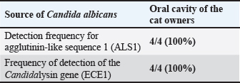 ABSTRACTBackground: Candida albicans is a ubiquitous commensal fungus and is capable of transitioning from commensalism to infection. Aim: To isolate and identify Candida spp. from oral swabs of domestic cats. Detection of virulence factors, agglutinin-like sequence agglutinin-like sequence 1 (ALS), and Candidalysin (ECE1) genes exploration of the possible relationship between Candida and potential risk factors in cat owners. Methods: A total of 119 oral swabs were collected from cat owners and streaked directly on Sabouraud’s dextrose and chrome agars. Confirmation was performed by testing the isolates using the Vitek 2 compact system and conventional polymerase chain reaction (PCR) using primers specific to the ITS4 and ITS5 regions. ALS and ECE1 genes were detected using conventional PCR. Results: The total number of Candida spp. isolated from the oral cavity of cat owners was 10/119 (8.40%). Correlations were reported between the isolation of Candida from the oral cavity and age group; use of oral antibiotic drops; diabetes mellitus; oral lesions; and vitamin D3 deficiency (p value < 0.001). No significant correlation was reported between sex, season, smoking habit, denture wearing, steroid inhalation, immune suppression, and Candida isolation from the oral cavity of cat owners. ASL1 and ECE1 were detected in 100% of C. albicans isolated from the oral cavity of cat owners. Conclusion: This study reveals a low prevalence but high pathogenic potential of oral C. albicans in domestic cat owners, as evidenced by the universal presence of major virulence genes (ALS1, ECE1). Older age, antibiotic drops, Diabetes miletus, oral lesions, and vitamin D3 deficiency were associated with the risk of colonization. The commonly suspected risk factors showed no association. The universal presence of ALS1 and ECE1 highlights the pathogenic threat posed by these yeasts. Keywords: Candida, Cat owners, Oral mucosa, Virulence, Zoonoses. IntroductionCandida albicans is a ubiquitous commensal fungus constituting a significant component of the human mycobiota, persistently colonizing the oral, gastrointestinal, and vaginal mucosa in a substantial proportion of the healthy population (Lemberg et al., 2022). However, C. albicans also exhibits pathobiont behavior, capable of transitioning from commensalism to infection. These infections range from superficial mucocutaneous manifestations (e.g., oropharyngeal candidiasis and vulvovaginal candidiasis) to severe, disseminated, and often life-threatening systemic candidiasis, particularly in healthcare settings (Calderone and Clancy, 2012). The oral cavity hosts multiple Candida species, including C. albicans, C. glabratas, C. krusei, C. parapsilosis, C. pseudotropicalis, C. stellatoidea, and C. tropicalis (Jafar, 2021). In immunocompetent and immunocompromised hosts, oral candidiasis can present as several distinct conditions, such as hyperplastic candidiasis, atrophic (denture) candidiasis, pseudomembranous candidiasis (thrush), linear gingival erythema, median rhomboid glossitis, and angular cheilitis Sharon and Fazel, 2010; Bhosale et al., 2023). This infection exhibits a broad clinical spectrum: superficial candidiasis (the most frequent form) involves mild acute presentations, whereas disseminated candidiasis (predominantly in immunodeficient states) can be fatal (Ahmad et al., 2020). The disruption of normal host immunity allows C. albicans to cause thrush. Yeast proliferates on the oral mucosa, inducing the desquamation of epithelial cells and accumulation of keratin, bacteria, and necrotic debris. This debris coalesces into a closely adherent pseudomembrane. Although uncommon, underlying mucosal involvement can include extensive edema, ulceration, and necrosis (Hashemi et al., 2019) A critical determinant of susceptibility identified across multiple studies is the host immune status. Systematic analyses of patient cohorts consistently show that C. albicans infections occur predominantly in immunocompromised individuals (Li et al., 2017). Furthermore, robust genetic and clinical evidence specifically links the development of recurrent or persistent mucocutaneous candidiasis to defects in adaptive cellular immunity, particularly impairments in T cell function and the IL-17 signaling axis, whether acquired or inherited gain-of-function mutations, AIRE deficiency, IL-17 receptor/ligand deficiencies (Li et al., 2017). The equilibrium between harmless colonization and pathogenic invasion is governed by a complex interplay of host defenses and microbial factors. While intact host immunity, especially involving T cells and IL-17 responses, is unequivocally essential for containing fungal overgrowth and preventing tissue invasion (Li et al., 2017), the intrinsic virulence potential of the colonizing C. albicans isolate is also a major contributing factor to disease outcome. Candida albicans exhibits substantial intraspecies genetic diversity that translates into measurable phenotypic heterogeneity among clinical isolates, leading to variations in adhesion capacity, morphogenetic switching (yeast-to-hyphae transition), stress tolerance, secreted hydrolase activity, biofilm formation, and metabolic adaptability (Ropars et al., 2018). Candida spp., particularly C. albicans, colonize the oral mucosae in 30%–60% of healthy humans (Marcos-Arias et al., 2011; Dąbrowska et al., 2018) and 10% of cats (Nikaein et al., 2023) Although most human candidiasis originates from endogenous flora, zoonotic transmission from pets, such as cats, remains possible due to close cohabitation behaviors (e.g., face-licking), which present potential transmission routes Vourc’h et al., 2022). Phylogenetic analysis of C. albicans isolates from various animal and human origins failed to find species-specific lineages, although the nearest-neighbor analysis did show some level of separation between human and animal isolates (Edelmann et al., 2005). Although the barriers to cross-species t