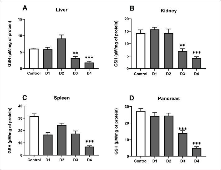 Fig. 1. Glucose levels of control and rats treated with different doses of ferrous sulfate (12.5 mg/kg [D1], 25 mg/kg [D2], 50 mg/kg [D3], and 100 mg/kg [D4]) for 06 weeks. Values are expressed as the mean ± SD. n=6 rats per group. Two-way repeated measures ANOVA, followed by Tukey HSD test was used to assess between- group differences, within-group differences (effect of time), and the dose × time interaction. Determination of oxidative stress biomarkerOxidative and neurotoxic markersGSH levelsGSH levels were evaluated in the kidney, liver, pancreas, and spleen following exposure to 4 different concentrations of ferrous sulfate (Fig. 2). Our results showed that the GSH levels were modulated. In the liver, GSH levels showed a biphasic response: GSH levels slightly increased after exposure to ferrous sulfate at concentrations of 12.5 mg/kg (D1, p > 0.64) and 25 mg/kg (D2, p=0.70) compared to the control group. However, GSH content decreased significantly after treatment with 50 mg/kg (D3, p= 0.001) and 100 mg/kg (D4, p < 0.001) (Fig. 2A). In the kidney (Fig. 2B), GSH levels decreased significantly following treatment with 50 mg/kg (D3, p=0.001) and 100 mg/kg (−68%, p < 0.001) of ferrous sulfate. In the spleen (Fig. 2C), GSH levels showed a different pattern, with a slight decrease at 12.5 (D1, p=0.07), 25 (D2, >0.99), and 50 (D3, p=0.10) mg/kg, which became more pronounced with the dose of 100 mg/kg (D4, −60%, p < 0.001) compared to control rats. Furthermore, pancreatic GSH contents showed a significant (p < 0.001) reduction only at D3 (p < 0.001) and D4 (Fig. 2D).