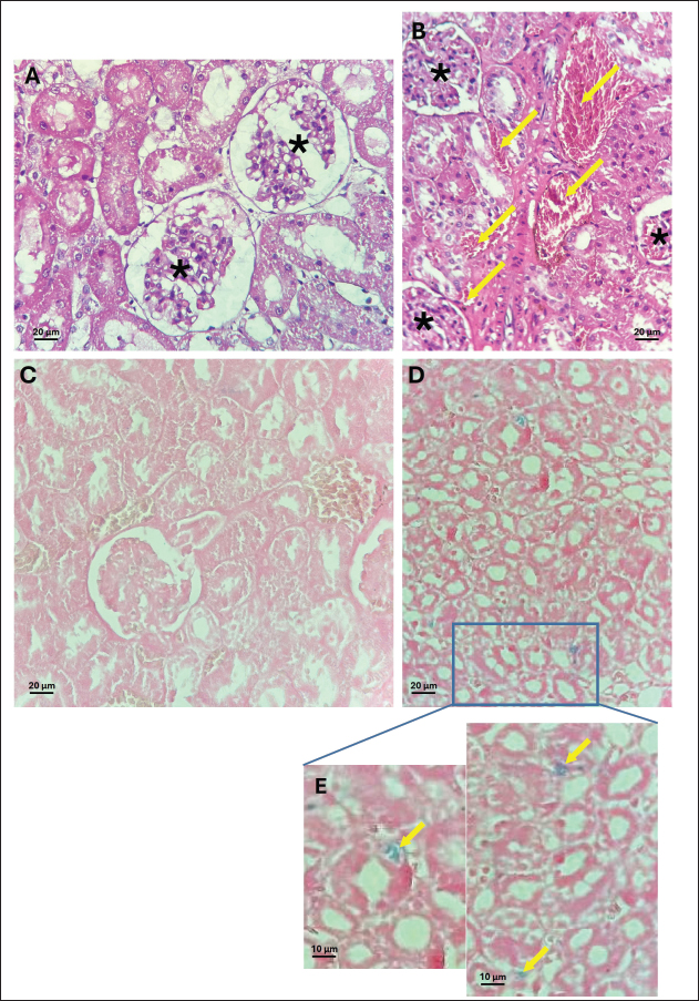 Fig. 9. Photomicrographs of HE stained kidney tissue. (A) Control (magnification 40X/0.65) and (B) 100 mg/kg ferrous sulfate-treated group. B: Congestion in interstitial veins of renal tissues (arrows) (magnification 40X/0.65). (C and D): Perls Prussian blue staining in the kidney of rats. C: control, absence of hemosiderin deposit (magnification 40X/0.65). D: (100 mg/kg), small tubular deposit of iron (score 1) (Magnification 10X/0.25). E (zoom on D): Deposit in several tubular cells (arrow). *: Glomeruli.