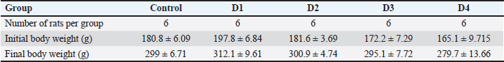 Evaluation of glucose levelsThe weekly assessment of blood glucose levels in rats treated with various doses of FeSO4 showed that both the duration of treatment (6 weeks) and the doses (D1, D2, D3, and D4) significantly affected this clinical marker (Fig. 1). Notably, a significant interaction was observed between time and dose (p=0.02), suggesting that the changes over time varied among the different study groups. In addition, the time factor had a highly significant effect (p < 0.001), and a significant main effect of dose was also found (p < 0.001).