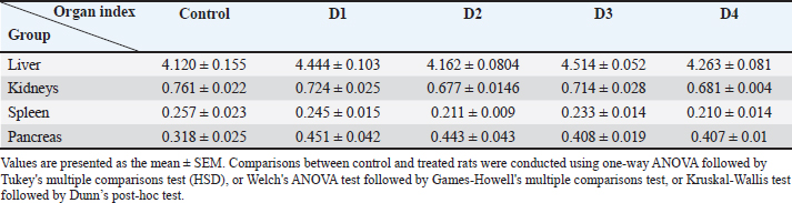 Table 2. Assessment of the relative weight of organs (organ index) in rats that received varying iron doses (12.5 mg/kg [D1], 25 mg/kg [D2], 50 mg/kg [D3], and 100 mg/kg [D4]) over 6 weeks.