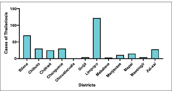 Conclusion: To the best of our knowledge, this is the first study conducted in the country based on consultation of Theileriosis records, and it provides a basis for future planning. The study was limited by the absence of information regarding the age of the animals, sex, type of farming system, clinical manifestations that the animals presented at the time of sample collection, and clinical outcome, as well as the absence of information related to the results of polymerase chain reaction analysis, which was carried out in Maputo, the country’s capital. These gaps highlight the need for training to standardize and improve the documentation of Theileriosis cases in the province and country in general. Intensive and timely interventions, especially tick control, should be prioritized in the districts of Limpopo, Bilene, and Chibuto during the peak period from March to May. Similarly, animal health authorities in the region should make a concerted effort to strengthen the surveillance of Theileriosis, particularly in underserved districts due to their remote location in relation to the Regional Veterinary Laboratory.