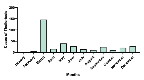 The monthly distribution of Theileriosis indicated a higher number of cases in March (n=146), May (n=40), December, and June (both n=27 cases). The lowest number of cases was observed in January (n=1), with statistically significant differences (X2 p < 0.02; Fig. 3). Regarding seasonality, we observed that the season influences the occurrence of Theileriosis cases, although cases were recorded in both seasons. The rainy and hot season (November to March) had the highest number of cases, with a cumulative total of 200 cases, compared with the dry and cool season (April to October), which recorded a cumulative total of 143 cases.