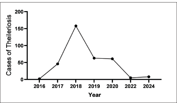 Between 2016 and 2024, 1.413 samples suspected of Theileriosis were recorded at the Regional Veterinary Laboratory in Gaza Province, of which 343 (24.3%) were positive and 1070 (75.7%) were negative. The record books did not contain information on the age of the animals, sex, type of farming system, clinical manifestations that the animals presented at the time of sampling, clinical outcome, or polymerase chain reaction (PCR) analysis results.