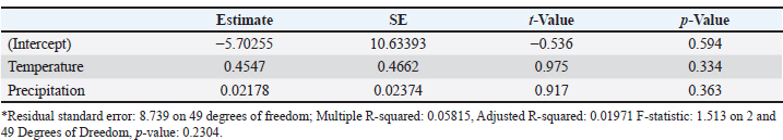 Our multiple regression results for positive samples and climate variables (temperature and precipitation) indicated that the model was not statistically significant (p=0.230), explaining only 1.9% of the total observed variance (adjusted R²=0.0197). The individual effects of environmental variables, temperature (β=0.455; p=0.334) and precipitation (β=0.022; p=0.363), had positive coefficients, although the two environmental variables were not statistically significant. The model adjusted to capture possible combined effects between environmental variables (temperature and precipitation) was also not statistically significant (p=0.263), maintaining low explanatory power (adjusted R²=0.0213; Tables 1 and 2; Fig. 5). The variance inflation factor (VIF) was also calculated to make the analyses more consistent, and the value obtained was less than 2, indicating moderate and acceptable multicollinearity.