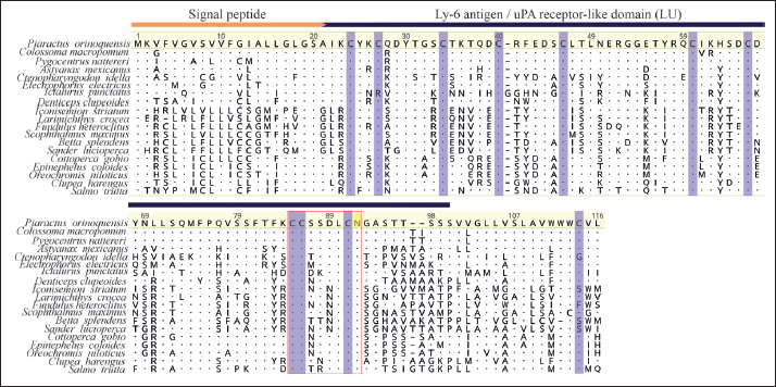 Fig. 1. Multiple alignment of fish CD59 aa sequences. Signal peptide (orange line) and Ly-6 antigen/uPA receptor-like domain (blue line) expression. Cysteine residues are highlighted in purple, and a red rectangular line indicates the conserved motif. GPI-anchoring sites are indicated in the background by a yellow oval.