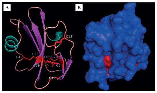 Fig. 2. Protein modeling of CD59 of red-bellied pacu. (A) a-helix residues are blue, b-sheet residues are violet, loop and unassigned residues are pink, and cysteines and disulfide bonds are red. (B) CD59 protein surface. The protein model was based on human CD59 (PDB ID: P13987–2j8b.1.A).