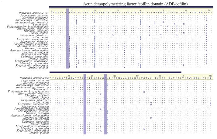 Fig. 3. Multiple alignment of GMFB aa sequences of fishes. Actin-DPF domain (blue line). Cysteine residues are highlighted in purple.