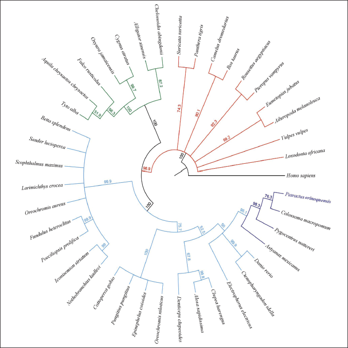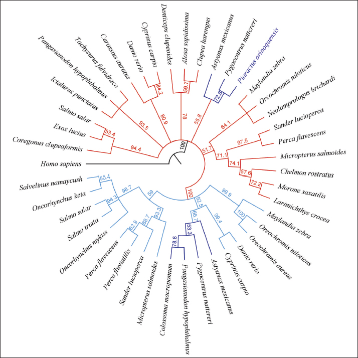 Fig. 5. Phylogenetic tree of CD59 generated by the neighbor-joining method. A total of 41 sequences were grouped with a bootstrap of 1.000.000 replicates. Gene PCR amplificationThe PCR-based profile revealed a 121-bp band of CD59 in the brain, blood, kidney, liver, gills, spleen, heart, and stomach, with no amplification in the intestine (Fig. 7A). Consistent bands of 135 bp were observed in the brain, blood, kidney, gills, intestine, heart, and stomach in gmfb. Notably, no detectable bands were detected in the liver or spleen (Fig. 7B). CD59 and gmfb gene expression in two experimental modelsIn the acute brain injury at 2 hours, the relative expression of CD59 was significantly lower in the brain-injured group compared to the control group (p < 0.0001). Conversely, gmfb expression was significantly elevated in the brain-injured group relative to control (p < 0.01) (Fig. 8). In the case of the CD59 gene in brain segments, an increased mRNA level was found in the olfactory bulb of the control group at 7 days post-lesion (dpl) (p < 0.05). Similarly, the telencephalon showed high expression of the CD59 gene in the control group compared with the injury group, with significant differences at 24 hours post-lesion (p < 0.001) and 7 dpl (p < 0.01). Moreover, in the optic chiasm, a statistical difference was observed in CD59 transcripts in the control group at 7 and 14 dpl (p < 0.05) (Fig. 9).