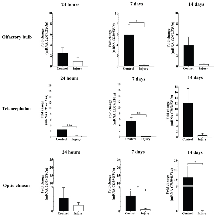 Fig. 9. Relative gene expression of CD59 in the olfactory bulb, telencephalon, and optic chiasm of the red-bellied pacu (Piaractus orinoquensis) at 24 hours, 7 days, and 14 days after brain injury. *p < 0.05, **p < 0.01, ***p < 0.001. EF1a was used as the reference gene. In GMFB, the molecular weight (16.8 kDa) and amino acid length (142 aa) were close to the molecular weight of human GMFB (17 kDa) (Lim et al., 1989; Shi et al., 2006). The absence of a signal peptide in GMFB is due to its intracellular protein condition, which prevents secretion without a signal sequence (Lim and Zaheer, 1995). The absence of N-glycosylation was similar to that reported by Kaplan et al. (1991) and several serine/threonine phosphorylation sites and phosphorylated proteins in GMFB were identical to those reported in human GMFB (Lim and Zaheer, 1995). The small number of mRNA functions found in gmfb was associated with the short 3 and 5' UTR length. The multialignment demonstrated high evolutionary conservation among species in GMFB, which can be explained by the high conservation of all members of the ADF/cofilin superfamily, which have evolved from a single ancestral protein as well as a similar structure composed of five internal β-strands, four of them with an antiparallel constitution, and most of them are surrounded by at least four helices (Lappalainen et al., 1998; Goroncy et al., 2009). The phylogenetic analysis presented a wide CD59 protein cluster among teleosts, as reported by Papanastasiou et al. (2007) in rainbow trout, Gan et al. (2015) in Nile tilapia, Yeh and Klesius (2007) in channel catfish, and Sun et al. (2013) in zebrafish.