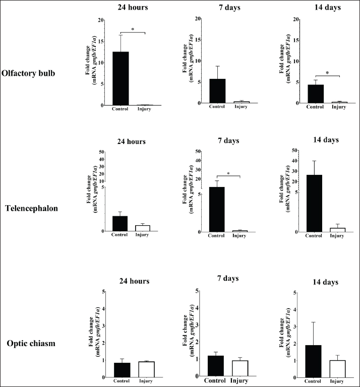 Fig. 10. Relative gene expression of gmfb in the olfactory bulb, telencephalon, and optic chiasm of the red-bellied pacu (Piaractus orinoquensis) at 24 h, 7 days, and 14 days after brain injury. *p<0.05. EF1a was used as the reference gene. Gene detectionThe stab wound procedure in the telencephalon mimics the cellular and structural changes associated with TBI caused by a mechanical impact and penetrating trauma, affecting multiple structures such as neurons, blood vessels, and glial cells (Kishimoto et al., 2012; Algattas and Huang, 2013). However, numerous authors have reported the telencephalic ventricular zone as a well-defined adult neurogenic region in vertebrates, including reptiles, birds, and fish (Doetsch and Scharff, 2001; Font et al., 2001; Zupanc, 2008). In our study, the CD59 gene was detected in the brain, blood, kidney, liver, gills, spleen, heart, and stomach, but not in the intestine, which is consistent with previous reports in the large yellow croaker (Liu et al., 2007; Sun et al., 2013). Although gmfb is expressed mainly in the central nervous system, it was present in the brain, blood, kidney, gills, and intestine in the present study. In other studies, gmfb expression has been detected in the colon, thymus, testis, ovary, and proximal renal tubule (Inagaki et al., 2004; Hakala, 2020). This overall expression can be related to other hypothesized functions of gmfb, such as erythropoietin-inducer and granulocyte-colony stimulator, and in CD4+ T cell maturation in the thymus (Utsuyama et al., 2003; Shi et al., 2006).