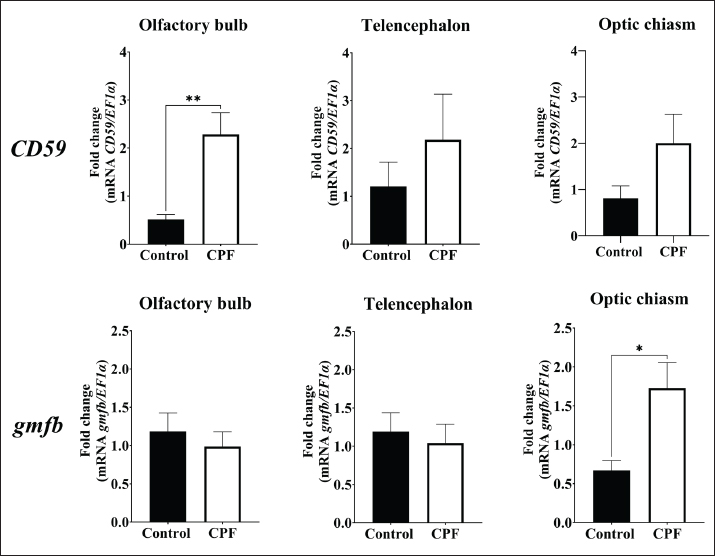 Fig. 11. Relative gene expression of CD59 and gmfb in the red-bellied pacu, Piaractus orinoquensis, after exposure to chlorpyrifos (0.011 μg/L). *p<0.05, **p<0.01. EF1a was used as the reference gene. qPCR experimentsA remarkable finding was observed in all brain tissue evaluated, where the injured group showed lower CD59 expression than the control group. The reason for the downregulation can be associated with autologous complement system immunomodulation in the brain, considering that most of the CD59 is concentrated in the oligodendrocytes by a GPI anchor due to its highly vulnerable condition to multiple disturbances of brain homeostasis (Scolding et al., 1998; Sun et al., 2013; Zeis et al., 2016). However, in the context of brain homeostasis disruption in TBI, we hypothesize that the loss of CD59 regulation promotes complement molecule overexpression. This hypothesis is supported by findings in human patients with acute and early chronic TBI, where significantly lower CD59 expression is observed compared with the control group and in patients with TBI (Bellander et al., 2001). Additionally, elevated levels of complement components, including C1q, C3b, C3d, and MAC, have been observed in patients with TBI compared with controls (Goetzl et al., 2020). In addition, MAC has been elucidated in secondary injury after TBI. In knockout CD59 mice, MAC deposition was higher than in the control group, resulting in increased neuronal loss and worse neurological outcomes at 7 days after trauma (Stahel et al., 2009). In the present study, low CD59 expression in the acute brain-injured group at 2 hours, 1, 7, and 14 days may be associated with the temporal persistence of CD59 deregulation. Regarding gmfb although the expression was elevated just after 2 hours post-lesion, the expression in the segments was lower days later than in the control group. This discrepancy indicates that the early upregulation is transient and downregulates rapidly or that it occurred in regions that were not sampled. Despite their beneficial role in brain recovery, Ahmed et al. (2019) have reported that neuroinflammation mediated by GMF can exacerbate neuronal injury through neuroinflammation, ROS generation, and oxidative stress damage in the TBI in vitro scratch-injury model. GMF KO mice showed a significant reduction in glial fibrillary acidic protein expression, a biomarker associated with axonal injury. This reduces neuroinflammation, reverses neuropathological events, and improves behavioral outcomes (Selvakumar et al., 2020). After the injury, the telencephalon, optic chiasm, and olfactory bulb in the control group showed higher expression than those in the injury group, contrary to the report by Yin et al. (2018) in the brain of adult zebrafish, where elevated gmfb mRNA levels were found. However, this difference may be related to the brain regions and the selected periods in our study. In CPF-exposed fish, the early expression of gmfb and CD59 in the optic chiasm and olfactory bulb, respectively, may suggest CPF-induced neurotoxic effects. Moreover, these anatomical biases might indicate a preferential localized immune response or vulnerability to this organophosphate. CPF can induce oxidative cellular stress, disrupt mitochondrial function, and affect cell viability (Xing et al., 2012; Peng et al., 2015). In Ctenopharyngodon idella exposed to 0.015 µl/l of CPF, histopathological alterations, including cellular damage, neuronal degeneration, and vacuolization, have been reported (Khan et al., 2021). Furthermore, the elevated expression of gmfb in CPF-treated specimens may reflect its role in mediating oxidative stress-related damage, potentially through the induction of nitric oxide production (Ahmed et al., 2019). CPF exposure has been linked to inflammation in various organs, including the brain, due to the upregulation of proinflammatory biomarkers (Lopes-Ferreira et al., 2023). One potential response to this inflammatory process is CD59 overexpression, which inhibits MAC-mediated cell lysis, representing a neuroprotective response aimed at preventing complement-mediated damage, particularly in regions vulnerable to toxicant accumulation (Ibrahim et al., 2020). ConclusionThe results of the present study reveal the primary structural and functional characteristics of CD59 and GMFB in P. orinoquensis, as well as their similarities to other fish species. In the brain injury assay, low CD59 gene expression suggests a persistent loss of immunomodulatory capacity following brain damage, as observed in patients with TBI. While gmfb expression in the injured fish group significantly increased in the whole brain, no significant changes were observed in specific brain segments, indicating possible region-specific differences or transient regulation. In contrast, overexpression of gmfb (optic chiasm) and CD59 (olfactory bulb) in CPF-exposed fish demonstrated the immunoactivity and damaging role of CPF. Our findings underscore the importance of CD59 and gmfb as molecular markers of the brain immune response of P. orinoquensis. AcknowledgmentsThe authors would like to thank the Laboratory of Immunology and Molecular Biology (LIBM) at the Universidad del Tolima for providing this study. Conflict of interestThe authors declare no conflict of interest. FundingNone. Authors’ contributionsRafael E. Castro and Iang Rondón contributed to the research conception and execution planning. Rafael E. Castro performed the experiments and collected the data. Rafael E. Castro and María P. Herrera performed the data analysis, wrote the manuscript, performed the bibliographic review, and edited the manuscript. Iang Rondón contributed to the review and editing of the manuscript. All authors have read and approved the final version of the manuscript. Data availabilityAll data supporting this study’s findings are available within the manuscript. ReferencesAhmed, M.E., Selvakumar, G.P., Kempuraj, D., Raikwar, S.P., Thangavel, R., Ba