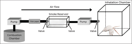 Peat biomass (m=3 g) was ignited in the combustion chamber using a lighter for 30 seconds. Following the activation of the combustion pump, the reservoir chamber’s input valve was opened, while the valve connecting the reservoir chamber and the inhalation chamber was closed. The smoke collected in the reservoir chamber was filtered using Whatman filter paper No. 42 to isolate particles with a diameter of less than 2.5 μm (PM2.5). The reservoir chamber was completed with a cyclone system consisting of a fan (for dilution) and a microorifice (for filtering particles with a diameter > 2.5 μm) (Budianto et al., 2023). Subsequently, the inlet valve of the reservoir chamber was shut, and the outlet valves of both the reservoir chamber and inhalation chamber were opened to inject PM2.5 into the inhalation chamber, where the Wistar rats were housed. The chamber was purged with filtered air for 5 minutes after each daily exposure session to remove residual aerosols. The concentration of PM2.5 in the exposure chamber was adjusted to the expected levels of 300 μg/m³, 500 μg/m³, and 700 μg/m³ by controlling the emission injection time (t). The Wistar rats were kept in the sealed inhalation chamber for 100 s per day. All exposure treatments were conducted using a gravimetric principle at a constant flow rate (Q) of 80 cm3/s and a surface area (A) of 0.50 cm2 (Budianto et al., 2023).