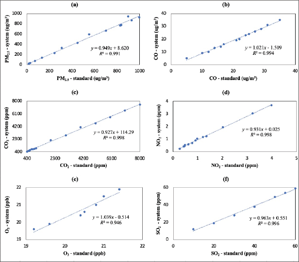 Fig. 3. Calibration curves of the used sensors: (a) PM2.5, (b) CO, (c) CO2, (d) NO2, (e) O3, and (f) SO2.