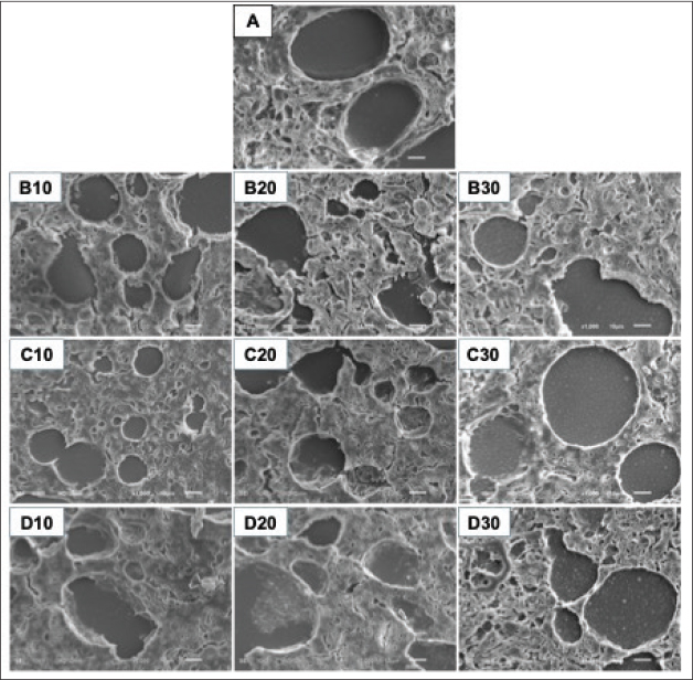 Fig. 5. SEM images of rat lung tissue from different exposure groups at 3,000× magnification with a scale bar of 5 μm. A. Control group, B10. 300 µg/m3 exposure for 10 days, B20. 300 µg/m3 exposure for 20 days, B30. 300 µg/m3 exposure for 30 days, C10. 500 µg/m3 exposure for 10 days, C20. 500 µg/m3 exposure for 20 days, C30. 500 µg/m3 exposure for 30 days, D10. 700 µg/m3 exposure for 10 days, D20. 700 µg/m3 exposure for 20 days, D30. 700 µg/m3 exposure for 30 days.