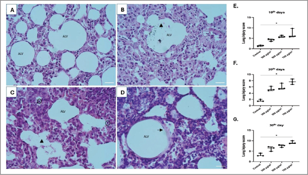 Fig. 7. Histopathological images of the lung with hematoxylin and eosin staining at 400x magnification, scale bar 50 μm. A. Control group, B–D. PM2.5 exposure groups, E–G. Comparison of lung injury scores in varying exposure durations (Kruskal-Wallis test, *p < 0.05, n=3). ALV: alveolus; triangle: debris in the alveolar cavity; circle: neutrophils; arrow: hyaline membrane.