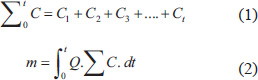 Measurements of PM2.5 and gas concentrations were measured every 2 seconds using the developed system, relying on the emission injection time. The obtained concentrations of PM2.5 and gas are shown in Figure 4. The total exposed concentrations of PM2.5 (Ct) were calculated using Equation (1) in units of μg/m3. The total concentration is interpreted as a continuous summation. When applied to a mass function, the integral calculates the total amount of the exposed mass (m) over a specific exposure time (Δt) and flow rate (Q) (Eq. 2). In line with this, this study has three PM2.5 concentration variations: C1 (68 s, 300 µg/m3), C2 (96 s, 500 µg/m3), and C3 (124 s, 700 µg/m3).