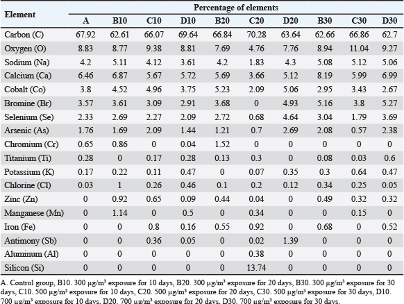 At the end of the treatment procedures, lung tissue samples were collected after 10, 20, and 30 days of exposure to PM2.5. The rats were euthanized using the exsanguination method following sedation with intraperitoneal injection of ketamine (0.1 cc) and Xylazine (0.05 cc). The lung tissue was fixed in a 10% NBF solution, left at room temperature for 48 hours, and then processed for scanning electron microscope/energy-dispersive X-ray spectroscopy (SEM-EDS) analysis and histopathological examination with hematoxylin and eosin (H&E) and Masson’s trichrome (MT) staining (Ji et al., 2023).