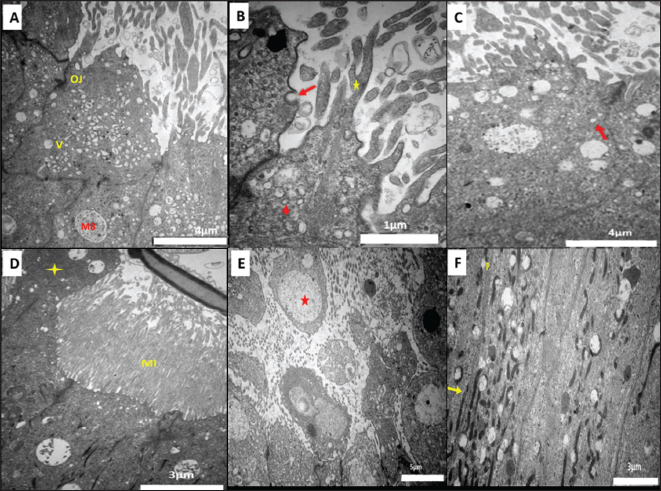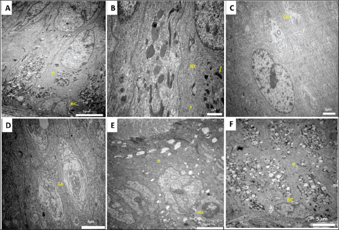 Fig. 1. Transmission electron micrograph of the epididymal duct of Meriz Bucks (autumn, October). (A)Caput (initial): principal cell (P), basal cells (BC), scale bar=5 µm. (B) Corpus (distal): principal cells (P) Rough ER (RER), scale bar=2 µm. (C) Caput (initial): Golgi apparatus (GA), scale bar=5 µm. (D) Caput (initial): large Golgi apparatus (GA), scale bar=4 µm.(E) Cauda (proximal): principal cells (P), Intraepithelial lymphocytes (IEL), scale bar=5µm. (F) Corpus (middle): principal (P) and basal cells (BC), scale bar=5µm. In the caput and corpus, the PCs had oval nuclei with slight indentations (Fig. 2C) or deep notches (Fig. 2D), whereas in the cauda, the nuclei were large and lobed (Fig. 2E). The BCs were small, pyramidal, with bilobed or irregularly oval nuclei in the caput and corpus (Fig. 2D, F) and rounded, notched Nuclei in the cauda (Fig. 3A). Some cauda BCs exhibited basal plasma membrane folding (Fig. 3A). ACs, located between PCs, had round or oval nuclei, prominent nucleoli, and a microvilli-free luminal surface, with mitochondria, vacuoles, rER, and Golgi apparatus cytoplasm (Fig. 3B). The NCs spanned the epithelium height, from the basal lamina to the lumen, with Spindle-shaped, dense nuclei, abundant vacuoles, and organelle-scarce cytoplasm (Fig. 3D). CCs had light-staining nucleoplasm and cytoplasm, with C-shaped vesicles, dense bodies, lysosomes and mitochondria. Intraepithelial Lymphocytes (ILEs)were irregularly rounded with indented nuclei and peripheral chromatin. Large and irregular IEMs with pseudopodia, triangular nuclei, and cytoplasm dense bodies, lysosomes, and organelles. IELs and IEMs were distributed throughout the epididymal epithelium (Fig. 3D). Ultrastructural seasonal changes: All BCs, ACs, NCs, CCs, and immune cells, lining all segments of the ED, showed no noticeable changes in their cellular ultrastructural characteristics. During all seasons of the year, except for the PCs. During the non-mating season, scarce microvilli and apical blebs were projected from the free surface of the PCs in all epididymal segments of the duct. Additionally, the number of vesicles, vacuoles, and multi-vesicular bodies was reduced (Fig . 4A). Furthermore, the PCs were characterized by small size, slightly heterochromatic nuclei, a relatively small Golgi apparatus (Fig. 4B), and less abundant rER and mitochondria (Fig. 4C).