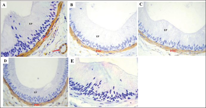 Fig .5. The expression of α-SMA in the initial segment of the Meriz Buck epididymal caput. A. Strong immunoreactivity observed in the vascular smooth cells (red arrow) peritubular muscular coat (PMC) during the mating season and in the epididymal epithelium (EP). Negative control IgG for α-SMA (E) exhibits diminished α-SMA staining in non-mating mice seasons (B–D). Magnification: 40 ×. scale bar=20 µm.
