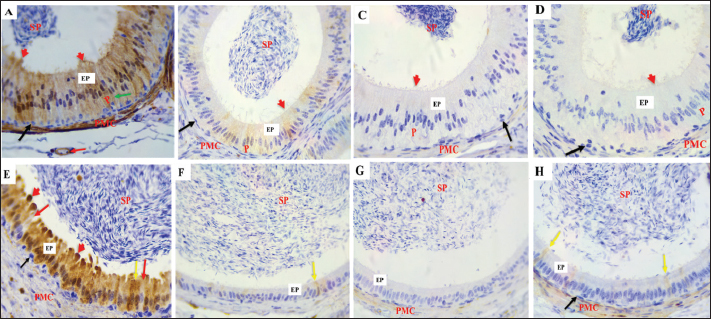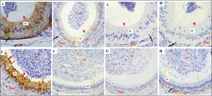 Fig. 8. S-100 protein expression in the epididymal duct of Meriz buck differs between the proximal corpus (A–D) and distal cauda (E–H) segments during mating and non-mating A: Strong immunoreactivity in principal cells (P), basal cells (black arrows), and thin cells (green arrow), the endothelium (red arrow), and the peritubular muscle coat are labelled during mating. season. The stereocilia (red arrowheads) and spermatozoa also stained positively. During non-mating Season (B–D), immunoreactivity is reduced, with only weak staining in the principal yellow arrows). Basal cells (black arrows) and transparent cells (red arrows). Distal cauda (E–H). Intense S-100 Expression in epithelial and supporting cells, including apical blebs (red arrowheads) During the mating season (E). Minimal or no staining observed in samples from the non-mating season (F–H). Spermatozoa (SP), peritubular muscle coat (PMC), and apical blebs are shown in red labelled where present. Magnification: 40x.
