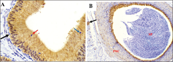 Fig. 9. S-100 expression in the epididymal duct of Meriz bucks. A: Preliminary portion of the caput during the non-mating season, exhibiting a negative reaction lymphocyte inside the epithelial cells (blue arrow), intraepithelial macrophages (red arrow), and basal cells (black arrow) Magnification: (40x). B: Distal portion of the cauda during mating season, focusing on the nerve trunk (black arrow), peritubular muscle coat (PMC), and Spermatozoa (SP)(10x). C-von willebrand factorThe results of the present investigation demonstrated that VWF immunoreactivity was confined to VE cells throughout all seasons in the Epididymal parts (Figs. 10 and 11). The staining intensity was strongest during the mating season (Figs. 10A, 11 A and D) relative to other seasons (Figs. 10 B–D, 11B–D, F–H). However, a negative expression in the epithelial cells of the ED or the peritubular muscular coat in all Epididymal segments throughout the seasons. Control IgG demonstrated negative staining for VWF (Fig. 10E). This study found that the α-SMA area was higher in autumn. In comparison to other seasons (p < 0.05, Fig. 12D). The quantification of α-SMA in the ISs of the caput was higher in autumn than in spring, summer, and winter (4.44 ± 0.02; 1.34 ± 0.02; 2.6 ± 0.02; 2.20 ± 0.02 p=0.03), respectively (Fig. 12 D–F). Measurement of the S-100 ISs of the caput demonstrated that its levels were elevated in autumn relative to those in spring, summer, and winter (27.1 ± 0.01; 23.01 ± 0.01;22.6 ± 0.01; 25.4 ± 0.01 p=0.002), respectively (Fig. 12A–C). VWF measurement of the ISs of the caput indicated that its Area was larger in autumn than in spring, summer, and winter (0.33 ± 0.09; 0.24 ± 0.09; 0.20 ± 0.09; 0.23 ± 0.09, p=0.001) (Fig. 12G–I). The quantification of α-SMA in the corpus was as follows: Higher in autumn than in spring, summer, and winter (5.50 ± 0.02; 3.45 ± 0.02; 3.51 ± 0.02; 2.76 ± 0.01, p=0.005) (Fig. 12D–F). Measurement of the S-100 ISs of the caput demonstrated that its levels were elevated in autumn relative to those in spring, summer, and Winter (3.9 ± 0.01; 0.45 ± 0.01; 0.7 ± 0.01; 0.6 ± 0.01, p=0.004) (Fig. 12A–C). The VWF measurement of the ISs of the caput indicated that its area was larger in Autumn than spring, summer, and winter (0.89 ± 0.09; 0.15 ± 0.09; 0.196 ± 0.09; 0.24 ± 0.09, p=0.007), respectively (Fig. 12G–I). The quantification of α-SMA in the cauda was higher in autumn compared to spring, summer, and winter (9.3 ± 0.01; 4.6 ± 0.01; 5.06 ± 0.01; 3.93 ± 0.01, p=0.001) (Fig. 12D–F). Measurement of the S-100 ISs of the caput demonstrated that its levels were elevated in autumn relative to those in spring, summer, and winter (7.5 ± 0.002; 0.09 ± 0.002; 1.01 ± 0.002; 0.05 ± 0.002, p=0.004), respectively (Fig. 12A–C). The VWF measurement of the ISs of the caput indicated that its area was larger in Autumn than in spring, summer, and winter (0.99 ± 0.01; 0.0.34 ± 0.01; 0.21 ± 0.01; 0.27 ± 0.01, p=0.001) (Fig. 12G–I).