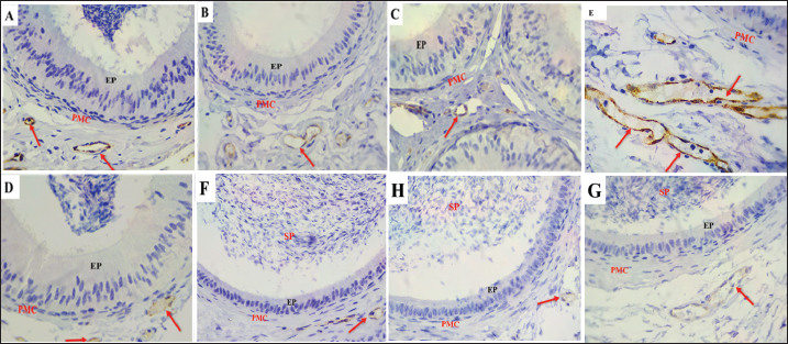 Fig. 11. VWF expression in the distal corpus (A–D) and distal cauda (E–H) of the epididymal duct showing: A: Strong immunoreactivity in VECs (red arrows) during mating season, the epithelium (EP), peritubular muscle coat (PMC), and spermatozoa displayed no staining (SP). VWF expression was weak during non-seasonal breeding (B–D) Strong immunoreactivity was identified in endothelial cells (red arrows) during mating. season, but no reaction was noted in the epithelium (EP) and peritubular muscle coat (PMC). Spermatozoa (SP) displayed no staining. Reduced VWF expression intensity during non-mating seasons (F–G). Magnification: 40X. Note E before D in the figures above.