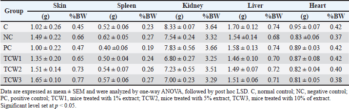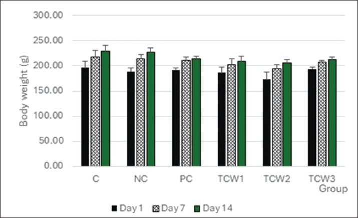 Fig. 1. Body weight of mice at day 1, day 7 and day 14. Data are expressed as mean ± SEM and were analyzed by one-way ANOVA, followed by post hoc LSD. C, normal control; NC, negative control; PC, positive control; TCW1, mice treated with 1% extract; TCW2, mice treated with 5% extract, TCW3, mice treated with 10% of extract. Significant level set at p < 0.05. Impact of Coffee liberica pulp on the weight of organBased on Table 2, the NC group exhibited a significant (p < 0.05) increase in skin weight compared to the control (C), reflecting epidermal thickening and inflammation characteristic of psoriatic lesions. Treatment groups, particularly TCW3, also displayed higher skin weight than control, which may indicate ongoing epidermal remodeling or partial recovery following treatment rather than active hyperproliferation. In contrast, the positive control (PC) group demonstrated near-normal skin weight, signifying effective suppression of inflammation. Splenomegaly observed in the NC group confirms systemic immune activation induced by imiquimod, while both PC and treatment groups showed reduced spleen size, suggesting attenuation of systemic inflammation and restoration of immune homeostasis. Table 2. Impact of Coffee liberica pulp on Balb/C mice organ weight such as skin, spleen, kidney, liver and heart.
