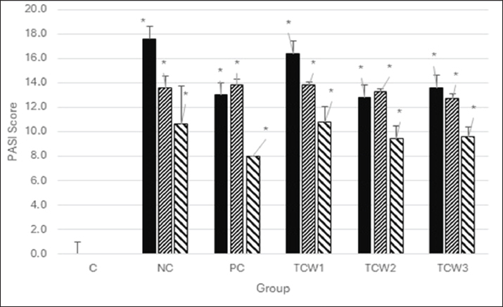 Fig. 2. PASI score on IMQ induced mice. Data are expressed as mean ± SEM and were analyzed by one-way ANOVA, followed by post hoc LSD. C, normal control; NC, negative control; PC, positive control; TCW1, mice treated with 1% extract; TCW2, mice treated with 5% extract, TCW3, mice treated with 10% of extract. Significant level set at p < 0.05.