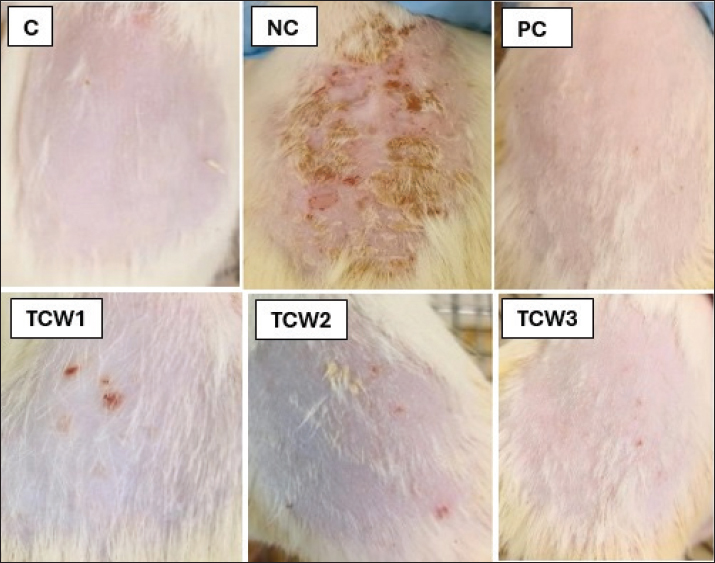 The NC group had reduced kidney weight compared to controls. This may indicate systemic stress or early renal involvement. Kidney weights in all treatment groups improved, particularly TCW2 close to normal. No significant changes in heart weight across all groups. Liver weights across groups remained relatively stable, though NC group and PC group showed minimal changes. Anti-Psoriatic activity of Coffee liberica pulp on Balb/C miceFigure 2 shows the cumulative PASI scores for erythema, thickness, and scaling. PASI score for the control group was negligible for all parameters. For the NC, the PASI score was higher for all the parameters. The PASI score, particularly for erythema, was significantly higher in the NC group than that in the other groups. However, TCW1, TCW2, and TCW3 showed a reduction in the PASI score for all three parameters compared with the NC group. The graph indicates that the treatments (TCW1, TCW2, and TCW3) seem to be effective in lowering PASI scores for erythema, thickness, and scaling compared to the NC. This suggests that these treatments are useful for treating psoriatic symptoms such as dermatitis. Figure 3 shows the phenotypical observations of the dorsal skin in mice with IMQ-induced psoriasis.