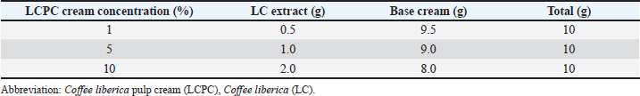 AbstractBackground: Psoriasis, also known as Psoriasis (Pso), is a persistent skin disorder characterized by erythematous, indurated, scaly, itchy, and often painful plaques. Although conventional medicine has been employed to treat psoriasis, it may cause adverse effects owing to its long-term use. Consequently, alternative medicine has become a popular option to address this issue. Coffee liberica pulp, a commonly overlooked waste product, has been found to have numerous benefits for humans. Aim: This study investigated the effectiveness of Liberia coffee pulp extract using an imiquimod (IMQ)-induced mouse model that replicated several features of psoriasis in humans. Methods: The study involved applying IMQ cream and other topical treatments to the shaved dorsal skin of mice. The psoriasis Area and Severity Index score, body weight, organ weight, expression of interleukins in the skin and serum, and full blood count were measured. Results: The results showed significant changes (p < 0.05) in skin weights in the negative control group compared with other groups. No significant changes in other organ weight were observed in any groups. However, the full blood count revealed significant changes (p < 0.05) in haemoglobin and white blood cell counts. The levels of interleukin 17a, interleukin 22, and interleukin 23 levels showed significant differences (p < 0.05) between the positive and treatment groups. Conclusion: This study found that C. liberica pulp has anti-inflammatory and antioxidant properties that help reduce skin inflammation. These findings suggest that C. liberica is a cost-effective source of natural antioxidants that can be used to alleviate psoriasis. Keywords: Psoriasis, Coffee liberica pulp, Imiquimod, Anti-psoriatic activity, psoriasis Area and Severity Index (PASI) score. IntroductionPsoriasis, commonly referred to as Psoriasis (Pso), is non-contagious, systemic immune-mediated skin disorders. The characteristic symptoms of Pso include the growth of erythematous, indurated, scaly, and itchy skin plaques, often accompanied by pain (Armstrong and Read 2020). The rapid growth of skin cells in Pso is triggered by inflammatory chemicals produced by T-cells, and defective inflammatory responses are essential (Qi et al., 2021). Acute dermatitis presents as a blistered and swollen red rash, whereas chronic dermatitis is characterised by a long-standing, thickened, and scratched area of the skin that is often darker than the surrounding area. Psoriatic scales typically appear as whitish-silver, thick, and red patches with well-defined edges and a scaly appearance. They can also cause itching and discomfort in affected individuals (Raj et al., 2021). Moreover, the presence of plaques can lead to feelings of embarrassment and low self-esteem among affected individuals (Raj et al., 2021). Some potential drawbacks may arise when using certain treatments for psoriasis. For instance, overproduction of skin cells can exacerbate the condition and cause discomfort to patients. Additionally, the use of this treatment may decrease the effectiveness of other medications that the patient may be taking, requiring them to adjust their dosage or switch to a different treatment. Coffee liberica pulp is derived from c. liberica, which is primarily cultivated in the Philippines, Malaysia, and Indonesia. Pumaras et al. (2024) indicated that C. liberica is typically grown in the mountainous regions of West Africa and Southeast Asia. The distinct smell that emanates from beans during roasting, reminiscent of durian, makes C. liberica an acquired taste. As a result, C. liberica beans are known for their strong aroma, which can be quite pungent and may be used by those who are not accustomed to it. Coffee pulp, which is the dried skin of coffee cherries, is a by-product of coffee production and has been found to possess various medicinal properties. Coffee pulp contains bioactive compounds with anti-inflammatory, antioxidant, and antimicrobial properties, making it a promising source for the development of natural products in the pharmaceutical industry. Coffee pulp is a rich source of chlorogenic acid, which has been associated with various health benefits, including reducing the risk of type 2 diabetes and lowering blood pressure. Pulped skins, also known as coffee pulp, were collected after the seeds had been removed from the cherries. These skins are typically discarded during the coffee production process but can potentially be utilised for various applications in the pharmaceutical industry. Coffee liberica has a unique and distinct taste, and its coffee pulp has potential medicinal properties that could be harnessed for various applications in the pharmaceutical industry. Imiquimod cream is often used to treat actinic keratoses on the face or scalp as well as superficial basal cell carcinoma in various areas of the body, including the trunk, neck, arms, hands, legs, and feet. Additionally, it can be effective in treating other skin conditions such as solar lentigines, seborrheic keratoses, and Bowen's disease (Nerurkar et al., 2017). Imiquimod cream functions by increasing immune system activity to treat genital and anal warts. In this study, imiquimod cream was used to induce psoriasis-like dermatitis in a mouse model; and is treat with Coffee liberica pulp extract align with Sustainable Development Goals 3 (Good health well-being) and 12 (Responsible Consumption and Production). Although the anti-inflammatory and antioxidant properties of coffee bioactives have been widely reported, most investigations have centered on coffee beans or green coffee extracts, leaving the potential of coffee pulp, a polyphenol-rich by-product, largely unexplored. This study advances current knowledge by evaluating the protective and immunomodulatory effects of coffee pulp extract in an imiquimod-induced psoriasis model, thereby providing new insights into its role in regulating the IL-23/Th17 cytokine pathway an