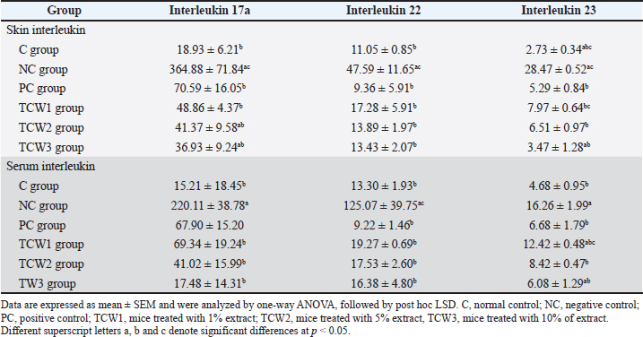 The results also show that there is a marked increase in white blood cell (WBC) was observed in the NC group and neutrophils, indicating systemic inflammation. The PC group showed normalization of WBC and neutrophils. Treatment with TCW, particularly TCW 1 showed significantly (p < 0.05) reduced leukocytosis and neutrophilia. Lymphocyte counts, which were suppressed in the NC group, were restored in the treatment groups, especially TCW 3, suggesting recovery of immune homeostasis. The platelet count increased in the NC group, a common feature in systemic inflammation and the acute phase response. All treatment groups showed a downward trend, with TCW 1 and PC group nearing normal levels. Effect of Coffee liberica pulp on skin and serum interleukin expressionTable 4 show, NC groups show remarkable significant (p < 0.05) increased all interleukins compared to the normal control group (C), reflecting strong activation of the Th17/IL-23 inflammatory axis in skin and serum. The control group showed the lowest expression levels of IL-17A, IL-22, and IL-23 in both skin and serum, confirming physiological baseline immune activity. However, for PC group, it shows that treatment with a standard anti-inflammatory agent significantly suppressed all interleukins compared to NC. The TCW1 group showed a moderate reduction in cytokine levels compared to the NC group. TCW2 exhibited a more pronounced suppression of cytokines, comparable to the positive control, while TCW3 demonstrated the greatest reduction, indicating a dose-dependent anti-inflammatory effect. Table 4. Effect of Coffee liberica pulp on Balb/C mice skin and serum interleukin expression.