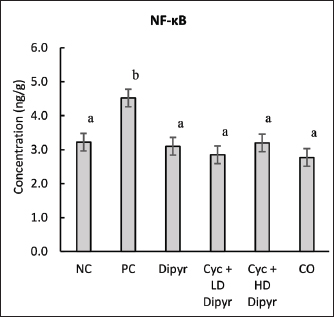 Fig. 4. Levels of glutathione, catalase, MDA, and TAC in the hepatic tissue. Values represent the means of six rats per group (columns) ± SEM (error bars). Different letters (a, b, c) denote significant differences between the groups at p < 0.05, as determined by one-way ANOVA followed by Duncan’s post hoc test. Dipyr alone maintained GSH, CAT, TAC, and MDA at levels comparable to the NC, suggesting intrinsic antioxidant activity without inducing OS. Moreover, the CO group showed no significant differences from NC in any parameter, confirming that the vehicle had no adverse impact. Overall, the results demonstrated that Cyc administration enhanced marked OS, evidenced by decreased GSH, CAT, and TAC levels, alongside elevated MDA levels. Dipyr coadministration counteracted these changes in a dose-dependent manner, underscoring its antioxidant efficacy in palliating Cyc-induced oxidative damage. NF-κB levels in the hepatic tissueNF-κB levels in the PC group were 40% higher than baseline (3.22 ng/g) in the NC group, reflecting enhanced OS-driven inflammation. On the other hand, Dipyr coadministration significantly reduced NF-κB activation in a dose-dependent manner, restoring values to near-normal levels (Fig. 5). These outcomes imply that Dipyr exerts anti-inflammatory capabilities against Cyc-induced tissue damage, possibly by modulating redox-sensitive transcription pathways, such as NF-κB.